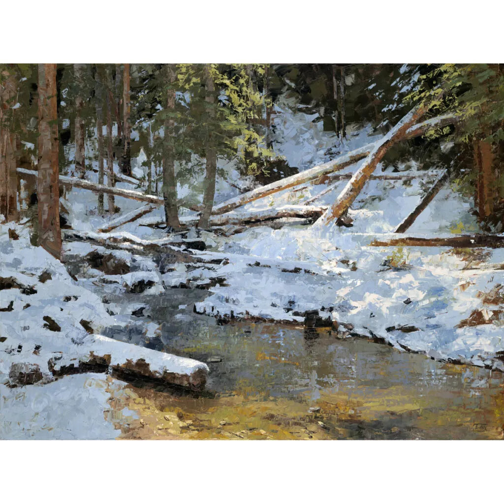 There are times during some snowfalls where the wind is still, and large flakes settle slowly. The loudest sounds are one’s own footsteps and labored breathing from the hike at altitude. After a pause the breathing slows and is replaces by a noticeable absence of sound. During the muted silence the snow clouds that hang over and around the trees and stream are pierced by rays of warm sunlight. The muted shadows become cool and bluer in comparison to the warm sunlit areas. There, in that place, both stillness and light share the same moment, and everything is right in the world.